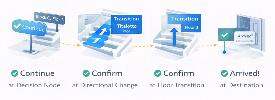 One of the most important lessons from this project was that navigation problems are often not information problems, but confidence problems. Students generally had access to maps and building information, yet they still struggled to reach destinations because they were uncertain about their decisions at key moments.