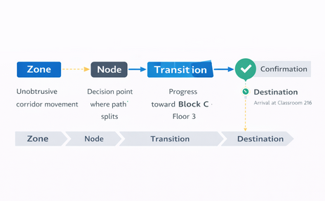 Navigation friction increases when spatial hierarchy is unclear (Campus → Building → Floor → Block → Room).